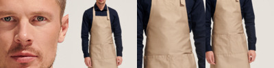 65% polyester/35% cotton. Self fabric neckband with metal buckle adjuster. Large front pocket with two compartments. Width 75cm. Length 90cm. Domestic wash 60°C.