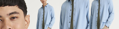 Classic long sleeve light weight denim shirt. Features include front button placket, button detail at cuffs and back yoke. Satin weave. Turned hem with single needle stitch detail. Fashion fit. Single needle contrast at armholes collar and front placket. 2 button placket at cuff. Button placket centre front fastening. Modern narrow collar. Yoke at back shoulder. No pockets for maximum embellishment area.