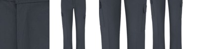 65% polyester/35% cotton. Traditional waistband with belt loops. Zip fly with button over. Two side pockets. Rear patch pocket. Two side leg cargo pockets with flaps.
