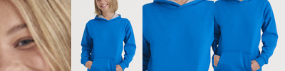 80% ringspun cotton/20% polyester.* Drop shoulder style. Brushed back fleece. Double fabric hood with contrast inner. No drawcords to comply with EU regulations. Front pouch pocket. Ribbed cuffs and hem. Twin needle stitching. Tear out label.