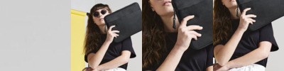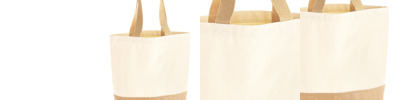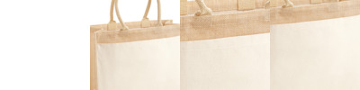 Laminated jute. Contrast carry handles (55cm long). Cotton canvas front pocket. Capacity 21 litres.