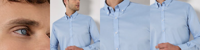 Fused stand-up button down collar. Two darts at back. Rounded hem. Back yoke. Two button cuff with buttoned cuff placket. Single stitched yoke and armhole. Spare buttons. Kustom Kit® woven back neck label.