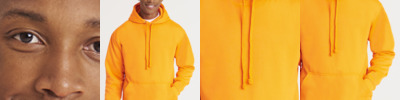 85% polyester/15% ringspun cotton. Brushed back fleece. Drop shoulder style. Double fabric hood with self colour flat lace drawcord. Front pouch pocket. Ribbed cuffs and hem. Twin needle stitching. Tear out label.