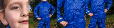 Polyester with PU coating. Waterproof 2000mm with taped seams. Windproof. Integrated concealed elasticated hood. Full length zip with studded storm flap. Two front pockets. Mesh ventilation panel on back. Ventilation underarm eyelets. Inner elasticated storm cuffs. Reflective trim on cuffs. Trousers have elasticated waistband. Slit access to pockets. Adjustable snap closing hem. Cut out label.