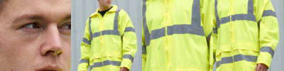 PVC coated polyester. Conforms to EN ISO 20471: 2013 + A1: 2016 class 3, EN343: class 3:1. Waterproof with taped seams. Windproof. Concealed adjustable hood. Full length zip with inner zip guard. Two reflective bands around the body, sleeves and one over each shoulder. Two front pockets. Rear vents. Inner elasticated storm cuffs. Co-ordinates with PW012.