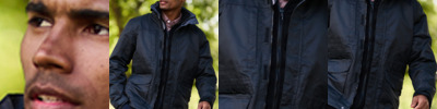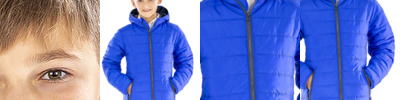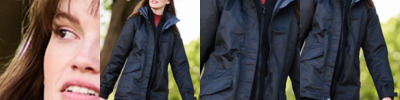 PVC coated polyester outer. Polyester padding and lining. Showerproof. Concealed hood under zip flap. Elasticated drawcord in collar. Full length zip with studded storm flap. Zip off sleeves. Adjustable cuffs. Two front pockets. Inner pocket, zip pocket and phone pocket. Drawcord hem. Zip access for decoration.