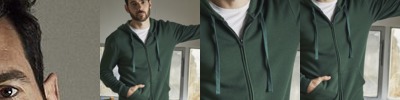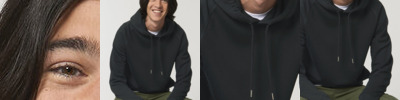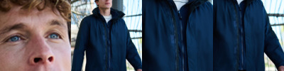 Raglan sleeve. Double-layered hood in self-fabric. Round drawcords in matching body colour with metal tipping. Metal eyelets. Inside herringbone back neck tape. Self-fabric half-moon at back neck. Slanted side seams with pockets. 1x1 rib at sleeve hem and bottom hem. Flatlock top-stitch on all seams.