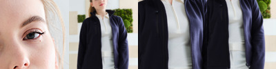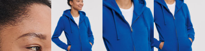 80% combed ringspun cotton/20% polyester. Cotton faced fabric. Brushed back fleece. Drop shoulder style. Ladies fit. Double fabric hood with topstitch detail. Flat lace drawcord with buttonhole eyelets. Taped neck. Full length covered YKK zip. Front pouch pockets. Ear phone access. 1x1 ribbed cuffs and hem. Coverseamed around hood, shoulders, armholes, cuffs and hem.