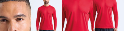 Wicking fabric. Stretch. Crew neck. Long sleeve. Lightweight. Twin-needle stitching on hem and arms. Mesh back. We recommend using block out vinyl and inks.Product contains no branded neck or waist label. Removable Kimble or looped garment tags. Inner seam label holds important product information on one label with a second label containing brand information which can be cut-away. UPF 40+.