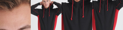 80% cotton/20% polyester. Brushed back fleece. Raglan sleeves. Two panel hood with contrast lining and drawcord. Contrast piping on sleeves. Contrast shaped side panels. Two front pockets. Ribbed cuffs and hem.