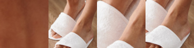 100% cotton towelling/mixed fibre soles. Open toe cotton terry outer. Soft padded sole.
