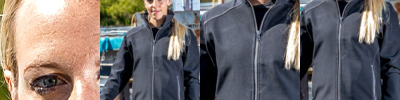 Three layer soft shell. 94% polyester/6% elastane outer layer. Waterproof, windproof and breathable mid layer. Polyester fleece lining. Full length zip with chin guard and inner zip guard. Right chest zip pocket. Two front zip pockets. Bound elasticated cuffs and hem. Tear out label.
