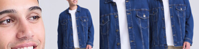 Cotton/elastane blended denim jacket with classic denim styling. 4 pocket design, shank button placket, button cuffs and adjustable back. Fashion fit. Stretch denim. 4 pocket styling. Classic light and dark blue washes. Contrast stitching. Classic denim jacket panelling. Button cuff detail. Inside back neck hanger loop.