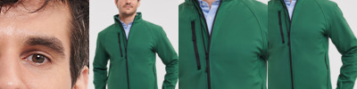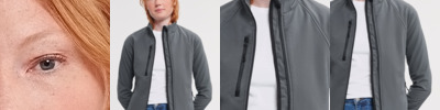 Three layer soft shell. 92% polyester/8% elastane woven outer. Performance membrane. Polyester micro fleece inner layer. Shower resistant 5000mm, windproof and breathable. Collar high full length zip with chin guard and inner zip guard. Mesh lined front panels. Right chest zip pocket. Two front zip pockets. Adjustable cuffs. Curved back drawcord hem. Access for decoration.