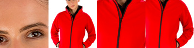 Two layer soft shell. Polyester soft shell outer. Recycled micro fleece inner layer (in transition). Elastane-free, crimped yarn stretch easy to print fabric. Showerproof, windproof and breathable. Shaped fit. Decorative top stitch. Full length contrast zip with chin guard and inner zip guard. Two front zip pockets. Elasticated bound cuffs. Cut out label. Designed for direct print, embroidery and transfer print (not DTG). Co-ordinates with RS232F.