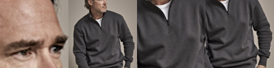 70% ringspun cotton/30% polyester. Brushed back fleece. Double dyed. Drop shoulder style. Ribbed collar, cuffs and hem with elastane. Taped neck with contrast stitching. Two front pockets. 40°C wash.