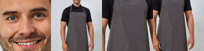 100% polyester with polyurethane coating. Waterproof and bleach resistant fabric. Self fabric neckband with plastic adjustable buckle. Self fabric 90cm ties. Width 72cm. Length 86cm. Industrial laundry 85°C. Domestic wash 60°C.