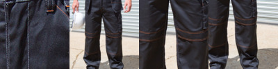 80% polyester/20% cotton twill. Water repellent, windproof and breathable. Double tab belt loops. Partially elasticated waistband. Zip fly with button over. Multi-use pockets with reflective tear release tabs. Two side pockets. Rear pocket. Contrast cargo pocket on each leg. Bar tack stress points.