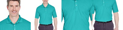 4.8 oz., 100% polyester mini-jacquard; Anti-bacterial; Moisture-wicking; Stain-resistant; UV 15-39 protection; Relaxed fit; Flat-knit collar;
