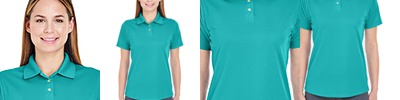 4.8 oz., 100% polyester mini-jacquard; Anti-bacterial; Moisture-wicking; Stain-resistant; UV 15-39 protection; Feminine fit; Flat-knit collar;