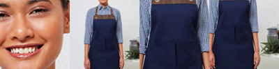 65% polyester/35% cotton. Easy care fabric. Faux leather trim and neckband. Neckband with adjustable stud closure. Large metal eyelets. Two pleat pockets. Width 72cm. Length 86cm. Domestic wash 60°C.