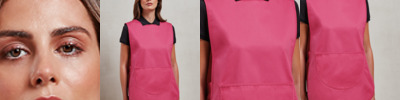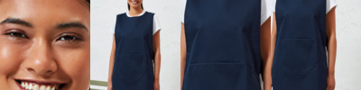 65% polyester/35% cotton twill. Easy care fabric. Large patch pocket. Adjustable stud side tabs. Self colour bound edges. Length 68cm. Industrial laundry 85°C. Domestic wash 60°C.