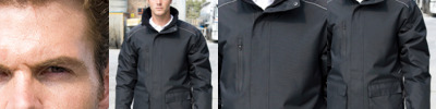 300D oxford polyester outer with PVC coating. Polyester padding. 210T polyester taffeta diamond quilted lining. Waterproof 2000mm with taped seams. Windproof. Detachable adjustable hood. Soft feel tricot lined collar. Full length zip with stud and tear release storm flap. Front patch pockets with side handwarmer entry. Right chest zip pocket. Inner pocket. Dobby design contrast panelling. Reflective piping. Tear release adjustable cuffs with inner ribbed storm cuff. Adjustable drawcord hem. Includes four coloured branded zip pulls.