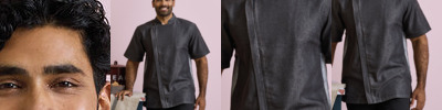Concealed zip through fastening. Underarm breathable mesh panels on White colourway. Underarm reverse colour on denim colourways. Mandarin collar. Side vents.