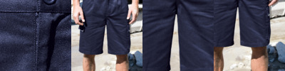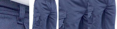 65% polyester/35% cotton kingsmill fabric. Part elasticated waistband with belt loops. D-ring. Zip fly with brass button over. Two side pockets. Rear patch pockets - one with a flap. Right leg cargo pocket with pen pocket. Ruler pocket. Twin needle seams.