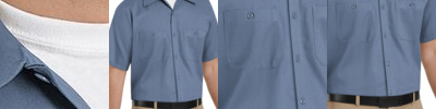 - Two button-thru, hex-style pockets with angled bartacks, bartacked pencil stall on left pocket