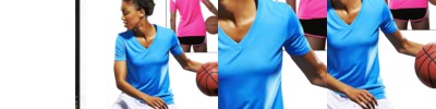 V-neck short sleeve. Relaxed, comfortable fit. Contrast angel wing panels on the back. 100% microfiber polyester pk maX. Inherent moisture wicking keeps you dry & comfortable. Treated with BodyFreshe to inhibit bacteria growth. Breathable, Easy Care. XS -2XL