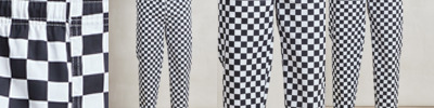 65% polyester/35% cotton twill printed check. Easy care fabric. Unisex sizing. Elasticated waistband with inner drawcord. Two side swing pockets. Industrial laundry 85°C. Domestic wash 60°C.