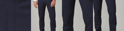 97% cotton/3% elastane. Slim fit. Stretch waistband. Flat front. Belt loops. Zip fly with button over. Two side pockets. Rear jetted pockets. Media pocket.