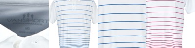 Physique-flattering gradual stripe print polo is engineered so logos fall between the stripes on every shirt, in every size. 95% polyester/5% spandex, 4� oz., Vansport? moisture management, gradual stripe sublimation print at front panel, jersey body, UV protection, antimicrobial, self-goods collar with collar band, Vansport? tagless label, three-button placket, hemmed sleeves, single-needle top-stitching, even-hem bottom with tailored side vents. Imported. S-3XL