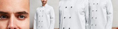 65% polyester/35% cotton twill. Easy care fabric. Mandarin collar stand with topstitching. 10 stud button wrap over closure. Comes with removable black plastic stud buttons. Turn back split cuffs. Industrial laundry 85°C. Domestic wash 60°C. Alternative colour studs available PR652.