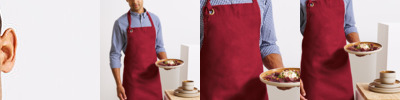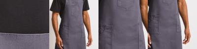A full bib apron with style features taken from the popular 'chino' style. A stitched patch pocket with rivets features at the centre top and two side pockets big enough to carry tablet devices sit just below waist height. The neck strap is loose and the wearer can loop the end through the buckle and use the pop-snap buttons to fasten in place.