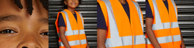 100% polyester. Conforms to EN 1150: 1999 (yellow and orange only). Self colour bound edges. Tear release front closure. Two reflective bands around the body and one over each shoulder.