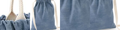 100% soft cotton denim. Grab handle/hanging loops. Cotton webbing carry handles. Drawcord closure. Tear out label. Capacity 12 litres.