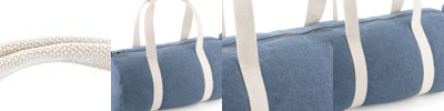 100% soft cotton denim. Contrast cotton webbing carry handles. Main zip compartment. Tear out label. Capacity 20 litres.