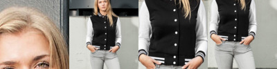 The college style presents itself as a cool stylish women's jacket with contrasted cuffs to offer a preppy look and feel. The inside brushed sweat fabric ensures a comfortable fit. Typical details include; striped rib cuffs at the collar, hem and sleeves and metal press-buttons to emphasize the cool look. Two pockets on the front, set-in sleeves and neck half-moon with neck tape.