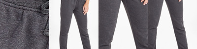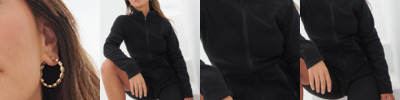 8 oz., stretch & sueded triblend terry; 51% rayon, 43% polyester, 6% elastine; 4-way stretch fabric withstriped loop back yarns; Set-in sleeves; Self fabric collar, waist & cuffs; Side gusset & hand pockets;