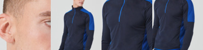 100% polyester single jersey. Wicking finish. Contrast zip neck with stand up collar. Contrast shoulder, upperarm and side panels. Concealed right zip pocket. Contrast stretch bound cuffs and hem. Tear out label.
