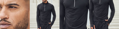 88% polyester/12% elastane peached interlock. Single jersey with wicking finish. Stand up self fabric collar. Raglan sleeves with flatlock stitching. 1/4 length zip with chin guard and reflective trim. Reflective detail on back of shoulder seams. Concealed zip key pocket on left back panel seam, with inner headphone access. Side panels. Elasticated bound cuffs and hem. Thumbholes and fold over cuffs. Tear out label.