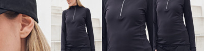 88% polyester/12% elastane peached interlock. Single jersey with wicking finish. Stand up self fabric collar. Raglan sleeves with flatlock stitching. 1/4 length zip with chin guard and reflective trim. Reflective detail on back of shoulder seams. Side panels. Concealed zip key pocket on left back panel seam, with inner headphone access. Thumbholes and fold over cuffs. Elasticated bound cuffs and hem. Tear out label.