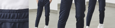 100% polyester piqué interlock. Slim fit. Elasticated waistband. Two side zip pockets. Open leg ends with zips. Tear out label.
