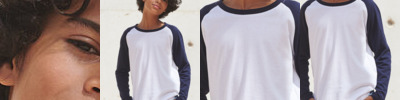 Tear-out SF (Skinnifit) label. Contrast raglan sleeve and ribbed neck with back-neck tape. Long-line fit and shaped side seams. Twin-needle curved hem. Unisex. Matches men's SK271 and women's SM271 Long sleeved baseball T's.