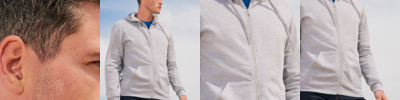 50% cotton/50% polyester. Brushed back fleece. Drop shoulder style. Hood with self fabric drawcord. Full length zip. Front pouch pockets. Ribbed cuffs and hem.