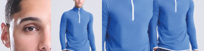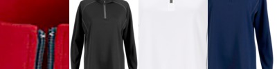 AWDis' own CoolFit blended fabric containing elastane that provides stretch for comfort and a great fit, tight fit, reflective tab on back of neck helps keep ear phone cords in place, self-fabric contrast colour binding at zip, cuffs and hem, raglan sleeve design creates ease of movement, ½ zip with stand-up collar for warmth, chin guard prevents irritation, simple tear off label makes it perfect for rebranding, UPF 30+ UV protection.