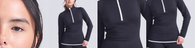 AWDis' own CoolFit blended fabric containing elastane that provides stretch for comfort and a great fit, girlie fit, reflective tab at back of neck helps keep ear phone cords in place, self-fabric contrast colour binding at zip, cuffs and hem, raglan sleeve design creates ease of movement, 1/2 zip with stand-up collar for warmth, chin guard prevents irritation, simple tear off label makes it perfect for rebranding, UPF 30+ UV protection.