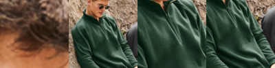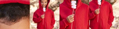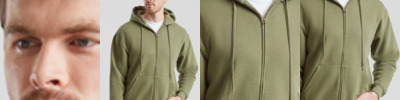 80% cotton/20% polyester. Drop shoulder style. Double fabric hood. Taped neck. Narrow full length covered zip. Front pouch pockets. Cotton/Lycra® ribbed cuffs and hem. Twin needle stitching. Cut out label.